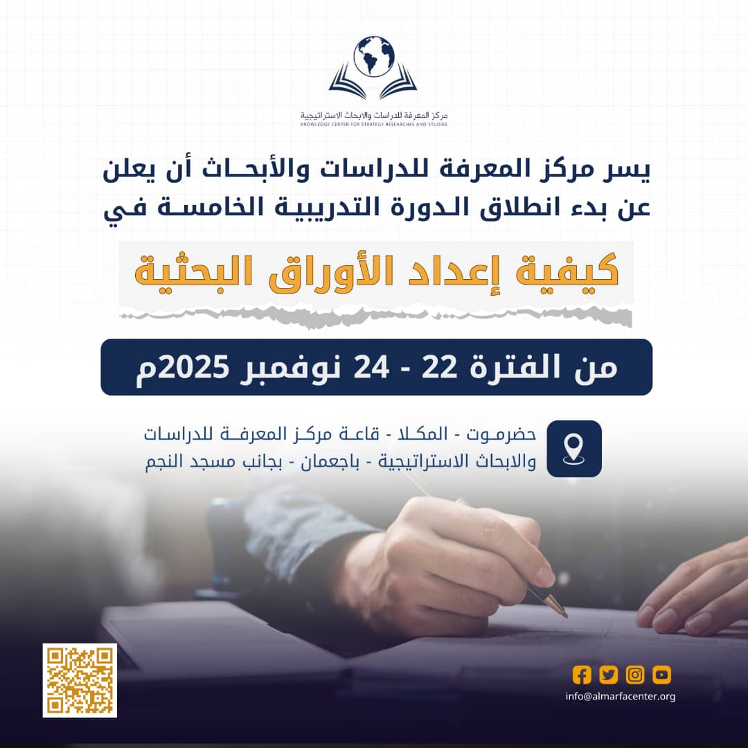 المكلا /إعلام المركزالسبت 22نوفمبر 2025م في إطار تعزيز المهارات البحثية لدى الشباب ، دشن مركز المعرفة للدراسات والابحاث الاستراتيجية مساء يوم أمس السبت الدورة التدريبية الخامسة في "إعداد الأوراق البحثية".حيث...